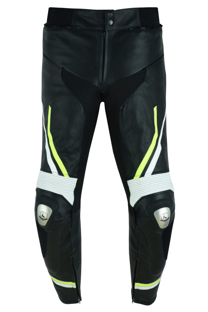 PANTALON DE CUERO PARA MOTORISTA CON PROTECCIONES DE TITANIO JF17 P NEGRO BLANCO AMARILLO FLUOR
