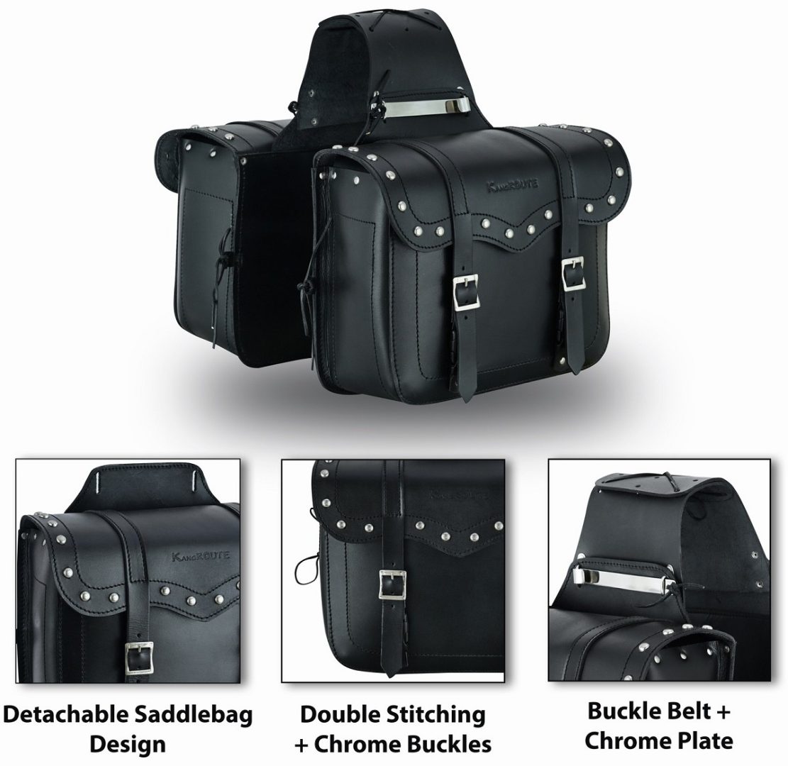 • Alforjas laterales fabricadas en piel de vaca resistente al agua,