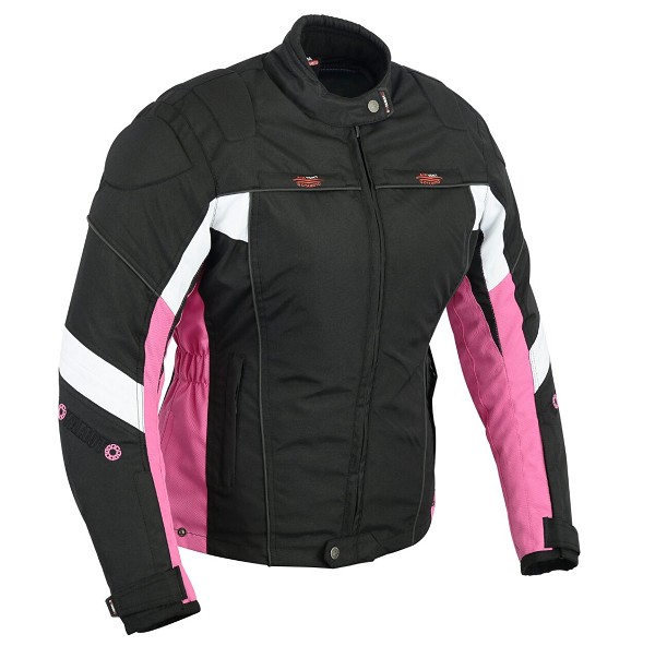 Chaqueta de cordura 3/4 para chicas con protecciones homologadas C.E. y desmontables en codos, hombros, espalda y forro térmico desmontable. 100% impermeable. fucsia negra